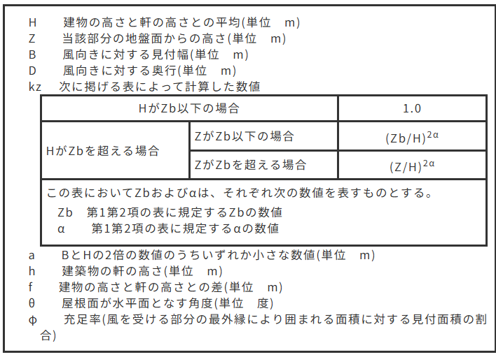 風圧力は、「速度圧に風力係数を乗じて計算する」こととされており、速度圧は次の式で計算されます。
